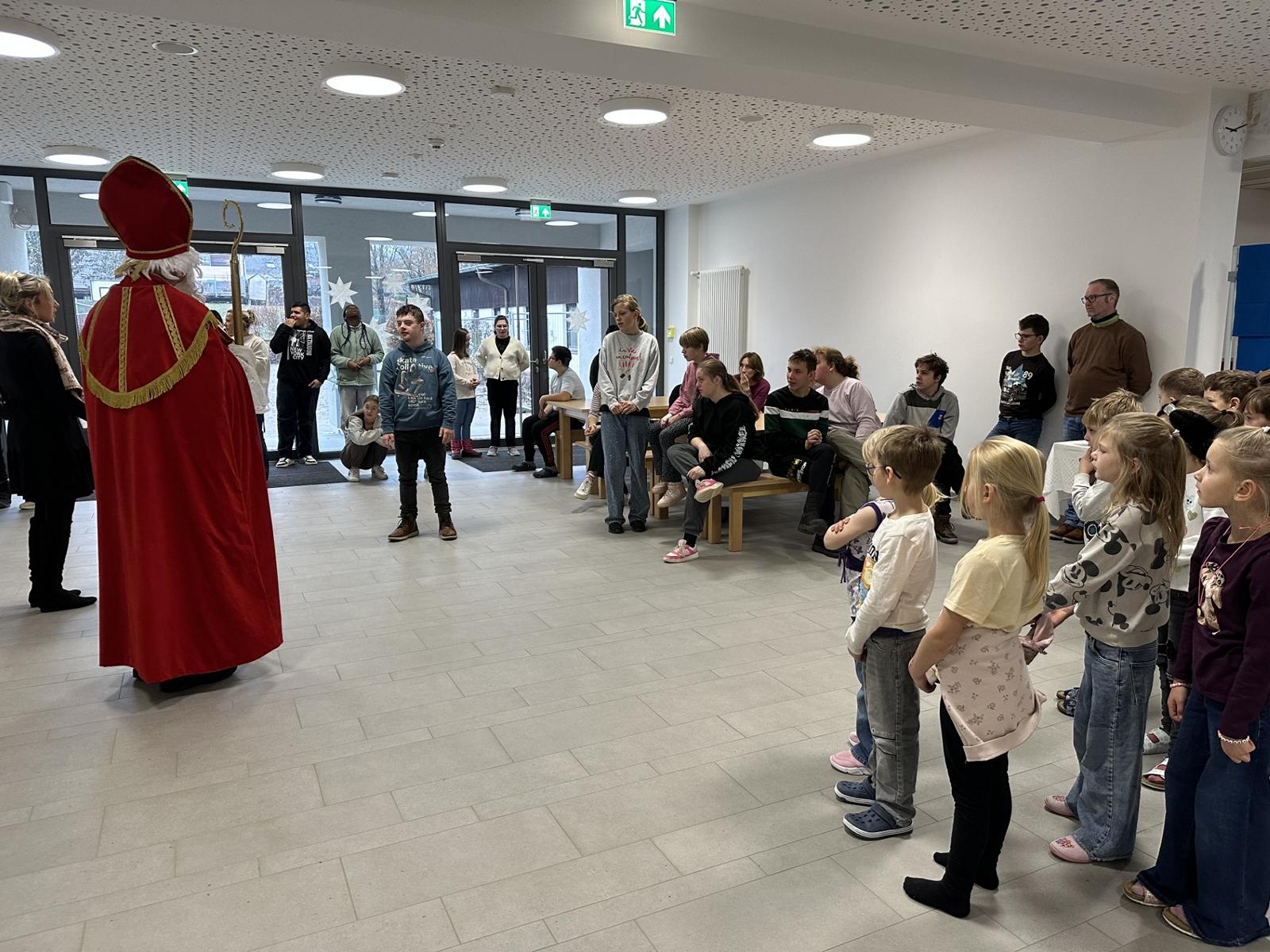 Tatsächlich kam der Nikolaus an die Schule. Die Kinder der Partnerklassen und die Schülerinnen und Schüler der 1. Klassen hatten ein paar Gedichte und Lieder vorbereitet. Darüber freute sich der Nikolaus sehr. Er zählte den Kindern natürlich auf, was sie alles schon in der Schule gelernt hatten. Allerdings wies er auch darauf hin, welche Dinge sie noch verbessern können. Die Schülerinnen und Schüler lauschten ganz gespannt und versprachen, dass sie weiterhin so fleißig sind und versuchen sich an alle Regeln zu halten. Als Belohnung dafür gab es die gebastelten Nikolaussäckchen – natürlich mit Füllung – zurück.