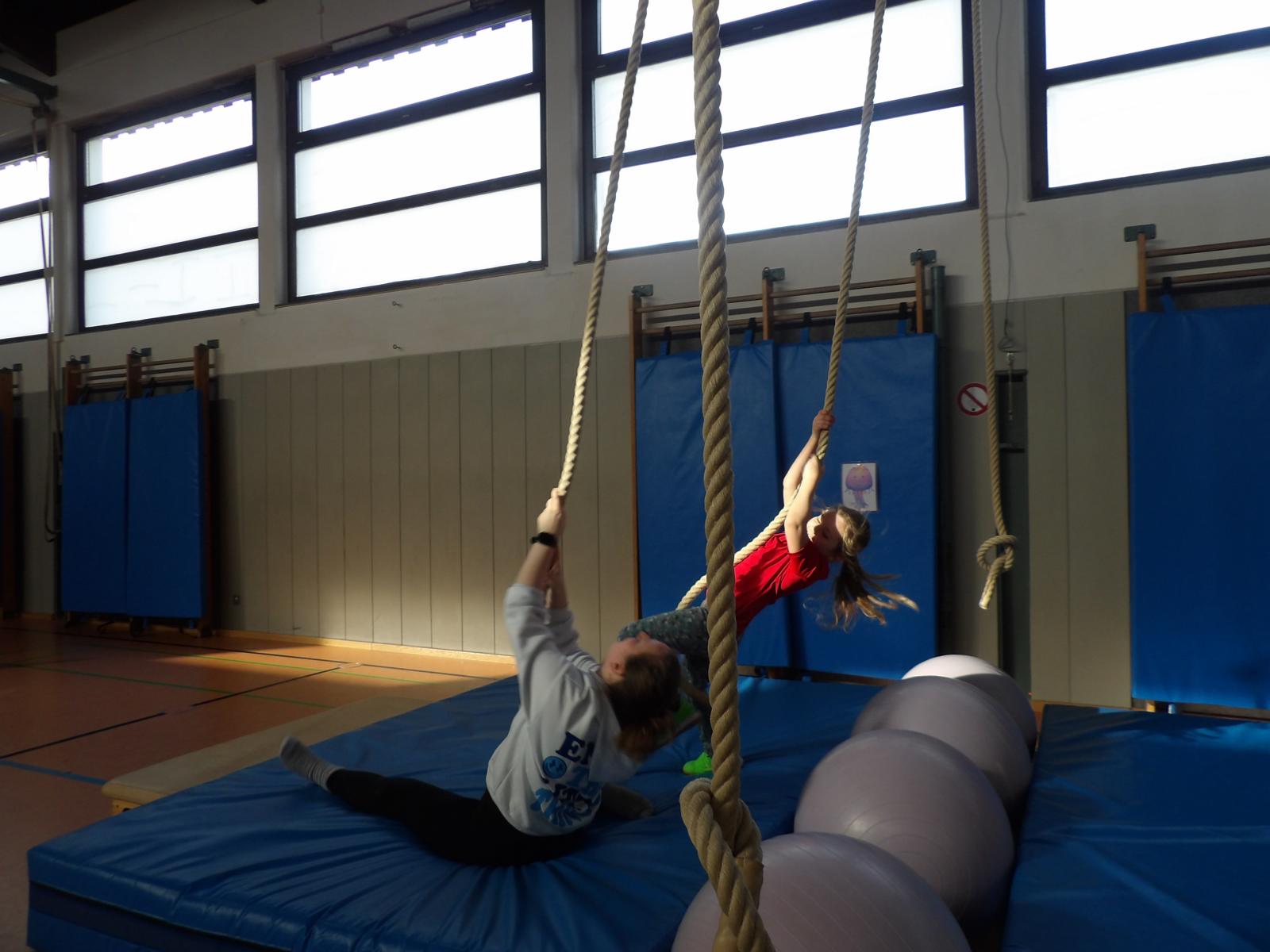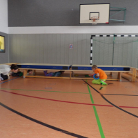 Nach der (Verschnauf-)Pause kam dann endlich der Besuch aus dem Kindergarten. Nachdem sich alle beim Laufen und Nachahmen verschiedener Unterwassertiere aufgewärmt hatte, starteten wir mit dem Turnen an den Stationen. Dazu wurden die Kinder in Gruppen eingeteilt und von jeweils einem Erwachsenen betreut. Es war total schön zu sehen, wie motiviert alle an die Bewegungsaufgaben herangingen und wie die Großen die Kleinen bei kniffligen Übungen unterstützten. Am besten kam bei den Kindern die Quallenstation an, wo man die gefährlichen Quallen (= Pezzibälle) nicht berühren durfte, und auch die Delfinstation zum hohen Springen schnitt bei der Selbsteinschätzung am Ende gut ab.
